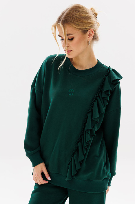 Современный, женственный свитшот, покроя oversize из комфортной ткани (футера пенье). Волан с необработанным краем (укреплён строчкой для надежности) пришит асимметрично на левой стороне изделия. Свитшот имеет спущенную линию плеча, прямой силуэт и притачную манжету по низу изделия. По центру переда вышивка – логотип в цвет ткани. Рукава с притачной по низу манжетой. Бейка горловины, низ изделия и манжеты рукавов выполнены из ткани - компаньона кошкорсе.