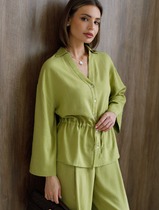 Состав: 70%Вис 30%Лен Плотность: 200 Г/м2Свободная блузка салатового цвета с кулиской на талии изо льна с вискозой, плотностью 200 Г/м2 - идеальный вариант для весны и лета. Сочетание льна и вискозы обеспечивает комфорт и прохладу в жаркие дни. Материал хорошо драпируется и мягко прилегает к фигуре, создавая струящиеся складки. Эта эффектная блузка сочетает в себе современный крой, удобство и стиль. Отложной воротник придает образу элегантность, спущенная линия плеча — модный и расслабленный акцент, а широкий рукав создает красивый и воздушный силуэт. Талия оформлена утягивающей кулиской, что позволяет регулировать посадку — создайте акцент на поясе для женственного силуэта или носите свободно для комфорта, отлично скроет возможные недостатки. Пуговицы по всей длине делают льняную рубашку особенно практичной, вы можете носить ее растегнутой, как верхний слой. Эта легкая блузка подходит для повседневного гардероба, смотрится красиво и стильно, обеспечивая максимальное удобство, подойдет и на большие размеры.