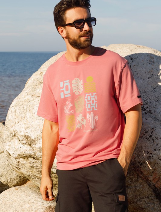 Состав: 92%Хлопок 8%ПУ Плотность: 170 Г/м2Перевод принта: Ready for paradise - готов к райскому отдыху. Футболка свободного кроя выполнена из премиального хлопка. Авторский принт нанесен красками с устойчивым покрытием. Благодаря эластану, носить изделие очень комфортно, и оно сохранит свой безупречный вид в течение долгого времени. На рукаве нашивка из эко-кожи с логотипом бренда.