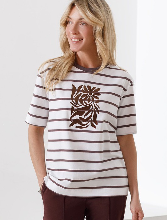 Состав: 92%Хлопок 8%ПУ Плотность: 170 Г/м2Модная футболка белого цвета в широкую горизонтальную полоску кофейного цвета привлекает внимание своим интересным дизайном и ярким принтом. Благодаря прямому крою изделие комфортно садится на любую фигуру, в том числе на большие размеры, и не сковывает движений. Круглый вырез подчеркивает современный стиль, а натуральный материал плотностью 170 Г/м2 из хлопка с добавлением эластана обеспечивает удобство в повседневной носке и приятные тактильные ощущения. Прочность и износостойкая структура позволяют сохранять свежий внешний вид после множества стирок. Принт в виде цветка нанесен красками с устойчивым покрытием. Стильная футболка гармонично вписывается в любой гардероб и подойдет для прогулок, отдыха или неформальных встреч. Благодаря особенностям кроя модель хорошо сидит, скрывая недостатки и подчеркивая достоинства. Яркая футболка идеально сочетается с базовыми вещами, позволяя создавать новые интересные образы каждый день.