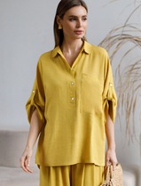 Свободная удлиненная блузка с карманом изо льна с вискозой