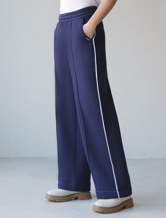Состав: 80%Хлопок 20%ПЭ Плотность: 320 Г/м2Теплые прямые брюки темно-синего цвета из эластичного футера трехнитки с начесом созданы для максимального комфорта в холодную погоду. Мягкий материал приятный к телу, хорошо держит форму, не вытягивается и не теряет форму даже при активной носке. Благодаря дышащим свойствам премиального футера, брюки подходят на любую погоду, обеспечивая оптимальный микроклимат и уют. Свободный крой и эластичный широкий пояс делает посадку удобной для разных типов фигуры и размеров, включая большие и маленькие. Застроченные стрелки визуально вытягиват силуэт и подчеркивают эстетичнось повседневных брюк, а контрастные тонкие лампасы добавляют актуальности образу. Благодаря особенностям трехниточного плетения и внутреннему слою с начесом, эти брюки отлично сохраняют тепло в холодные осенние и зимние дни, при этом в них вы будете выглядеть модно и современно. Вы можете составить комплект с артикулами: D49.143 и D49.142