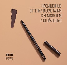 Карандаш для глаз наносится идеально ровно, сохраняя насыщенный и глубокий цвет. Легкая кремовая текстура, обеспечивает ровное и комфортное нанесение, позволяет создать любой вид подводки: строгие линии, легкие штрихи, четкие стрелки, а также стрелки с плавными мягкими контурами. Высокопигментированная формула, придает оттенкам насыщенность, глубину, стойкость, которая сохраняется в течение всего дня, не тускнея и не растекаясь. Особая мягкая кремовая текстура равномерно наносится, не требуя усилий, буквально одним штрихом. Палитра трендовых оттенков, позволяет создать яркий макияж, глубину и особую выразительность взгляду. Комфорт, кремовая текстура, яркость, глубина цвета