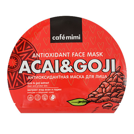 Выбери Антиоксидантную тканевую маску для лица CAFÉ MIMI, которая станет для тебя настоящим помощником в очищении кожи от токсинов! Маска защитит от воздействия негативных факторов окружающей среды и увлажнит кожу. Экстракт ягод асаи и годжи, которые являются природными антиоксидантами, защитит клетки кожи от преждевременного старения и обезвоживания, насытит витаминами, повысит тонус и упругость кожи.