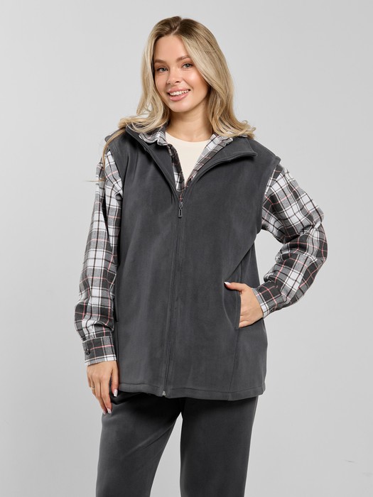 Жилет молодежный из трикотажного полотна «дабл-флис» (двухсторонний флис), прямого силуэта, с воротником «стойка», центральной бортовой застежкой на тесьму «молния». Для создания диагональных линий боковые швы переведены на полочку и оформлены в рельефные швы, в которых обработаны карманы.