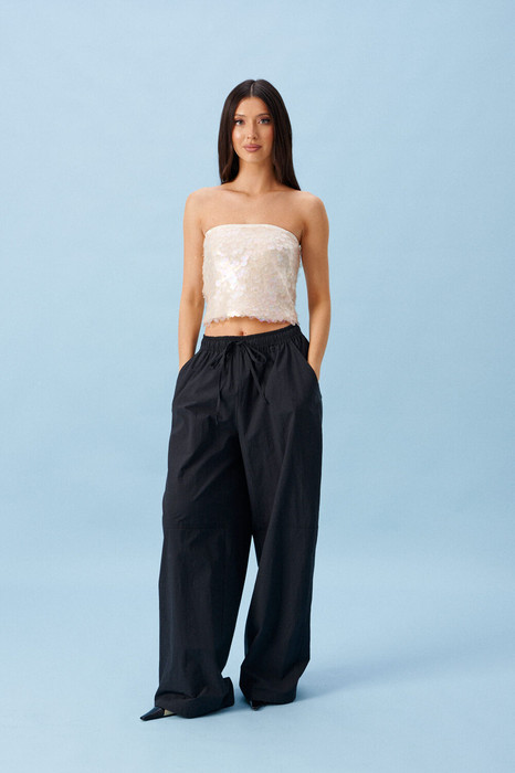 Топ свободного кроя. Выполнен из ткани с пайетками. С подкладкой. Верх на резинке. Длина 24 см.