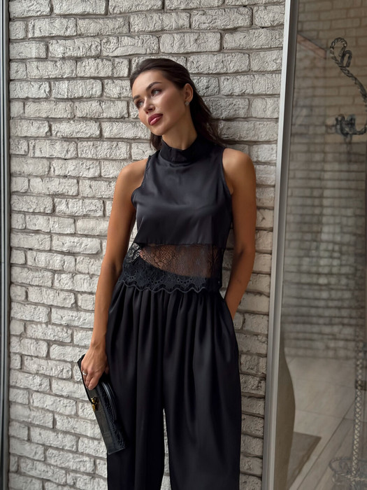 Элегантный топ с воротником стойкой.Топ свободного силуэта без рукавов. Он придаст женственности и игривости образу благодаря полупрозрачному кружеву.Легко комбинируется с юбками, шортами.