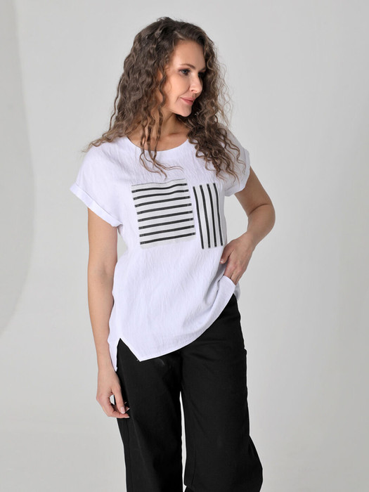 Стильная блуза из мягкой вискозы прямого силуэта с короткими цельнокроеными рукавами подходит для девушек и женщин разных возрастных групп. Оригинальная аппликация из принтованного льна и разноуровневая линия низа с декоративными разрезами акцентируют модный стиль блузки. Она хорошо сочетается со всеми брюками, жакетами и рубашками из нашей летней коллекции. Выбирайте понравившийся цвет, подбирайте обувь и аксессуары, и эта блуза выручит Вас летним днем в городе, на прогулке и на отдыхе. Собирайте свои образы, дополняйте их яркими аксессуарами и наслаждайтесь комфортом в летние дни!
