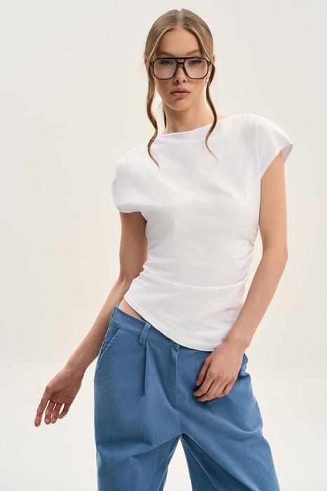 Топ с вырезом лодочкой без рукавов, ассиметричным низом и сборками - это ультрамодная вещь для вашего гардероба!