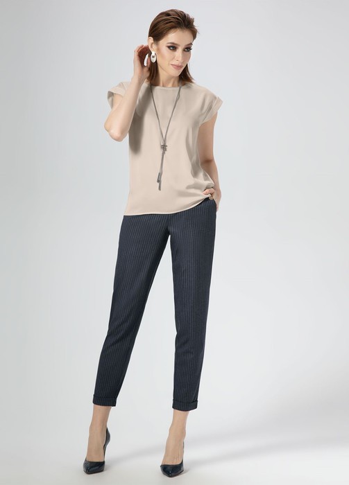 Лаконичная базовая блузка из тонкой струящейся ткани с небольшим блеском. Блузка полуприлегающего силуэта с круглым вырезом горловины. Горловина обработана тонкой планкой. Проймы блузки обработаны декоративными отложными манжетами. Такая универсальная базовая блузка станет неотъемлемым дополнением вашего гардероба.