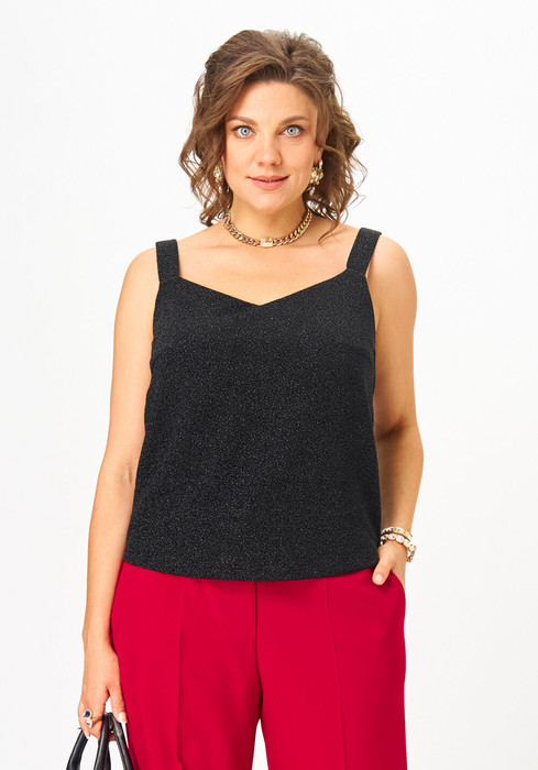 Топ прямого силуэта на широких бретелях, выполнен из трикотажного полотна с люрексом. Перед с нагрудными вытачками. Горловина переда лёгкой V-образной формы. Спинка цельнокроеная.