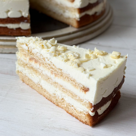 Изысканный торт из слоев нежного бисквита и творожного крема. Сверху торт украшен посыпкой из белого шоколада.