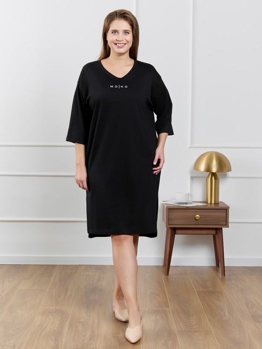 Туника женская из гладкокрашенного полотна «кулирка», свободного кроя, со спущенной линией плеча, втачными рукавами длиной до локтя, горловиной V-образной формы обработанной втачной планкой и принтом на полочке выполненным в технике «шелкографии». Модным элементом является разность длин фигурного низа изделия: низ полочки – прямой укороченный, низ спинки – удлиненный скруглённой формы.