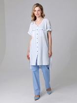 Двухцветная туника из кулирки. Светлый фон спереди, цветной сзади, принт в виде веточки с цветами. Рукава короткие, общая длина чуть выше коленей