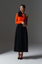 Юбка женская из экокожи. Перед юбки со швом посередине, переходящим в шлицу, с боковыми карманами и вытачками. Спинка со средним швом, заканчивающимся шлицей и вытачками. Застежка на тесьму молнию в переднем шве. Пояс притачной с эластичной резинкой сзади, с застежкой спереди на петлю и пуговицу. По швам проложены отделочные строчки. Изделие на подкладке.