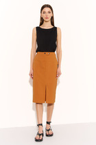 Юбка прямого силуэта, слегка заужена к низу, на передних частях выполнены талиевые вытачки, накладные карманы с клапанами из эко-кожи.