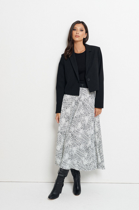 Юбка свободного кроя А образного силуэта выполнена из полотна белого цвета с контрастным черным принтом. Характеристики: А образный крой, широкая брендированная резинка, подкладка, в боковых швах карманы. Длина 92 см.
