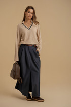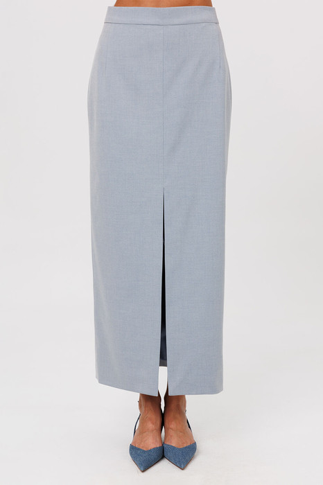 Юбка длинная прилегающего силуэта на притачном поясе. По переду вертикальные вытачки от пояса и центральным швом внизу заканчивающимся высоким разрезом. Спинка с 2-мя вертикальными вытачками от пояса, центральным швом и застежкой на потайную тесьму-молнию в центральном шве. Юбка на подкладке.