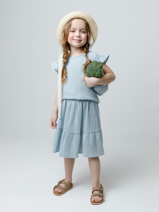 Легкая юбка для девочки из мягкого хлопкового муслина. По низу красивая оборка. Изделие сохраняет цвет, форму и фактуру жатости после многократных стирок.