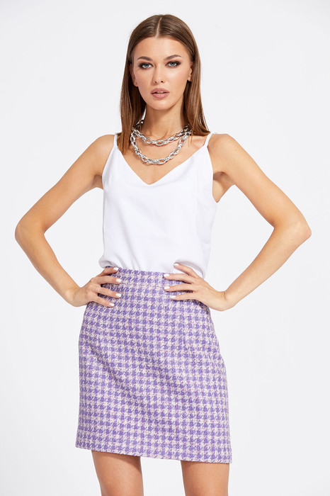 Юбка выполнена из костюмной ткани с рисунком "гусиная лапка". Юбка на притачном поясе, прямого силуэта, длиной выше линии колена. Застежка сзади в среднем шве на потайную молнию и пуговицу. В р.50-54 есть разрез сзади в среднем шве. Юбка на отлетной по низу подкладке.