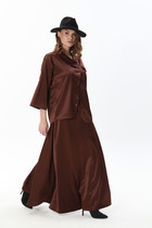 Юбка А-образного силуэта из плотного джинса. Передняя часть юбки со средним швом. С правой стороны вверху настрочен карман с клапаном- шлевкой. Задняя часть юбки со средним швом и вытачками. Сверху в среднем шве обработана потайная молния. Вдоль линии пояса настрочены шлевки. Пояс цельнокроеный на обтачке. Юбка на подкладке. Вдоль среднего шва по переду и по периметру кармана проложена декоративная строчка. К юбке прилагается сьемный ремень. Фурнитура может быть изменена с охранением художественного замысла. Длина юбки - 78 см, длина рукава - 60 см.