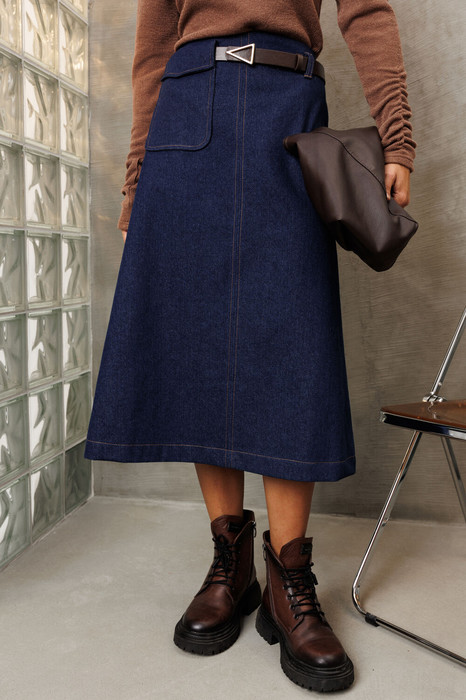 Юбка А-образного силуэта из плотного джинса. Передняя часть юбки со средним швом. С правой стороны вверху настрочен карман с клапаном- шлевкой. Задняя часть юбки со средним швом и вытачками. Сверху в среднем шве обработана потайная молния. Вдоль линии пояса настрочены шлевки. Пояс цельнокроеный на обтачке. Юбка на подкладке.  Вдоль среднего шва по переду и по периметру кармана проложена декоративная строчка. К юбке прилагается сьемный ремень. Фурнитура может быть изменена с охранением художественного замысла. Длина юбки - 78 см,  длина рукава - 60 см.