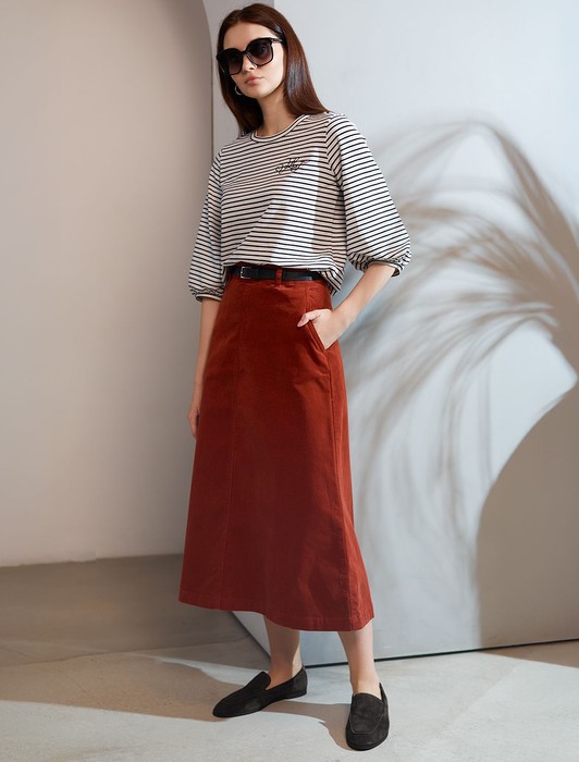 Состав: 98%Хлопок 2%ПУ Плотность: 310 Г/м2 Размер товара на первом фото: 42Юбка-миди трапециевидного силуэта выполнена из мягкого хлопкового микро-вельвета с добавлением эластана. Изделие комфортно садится по фигуре и не сковывает движения. Модель дополнена высококачественной фурнитурой с фирменным логотипом бренда. Хорошо комбинируется с вязаным трикотажем, блузками и денимом.Также прекрасно станет альтернативой деловым низам в нестрогом офисном дресс-коде.