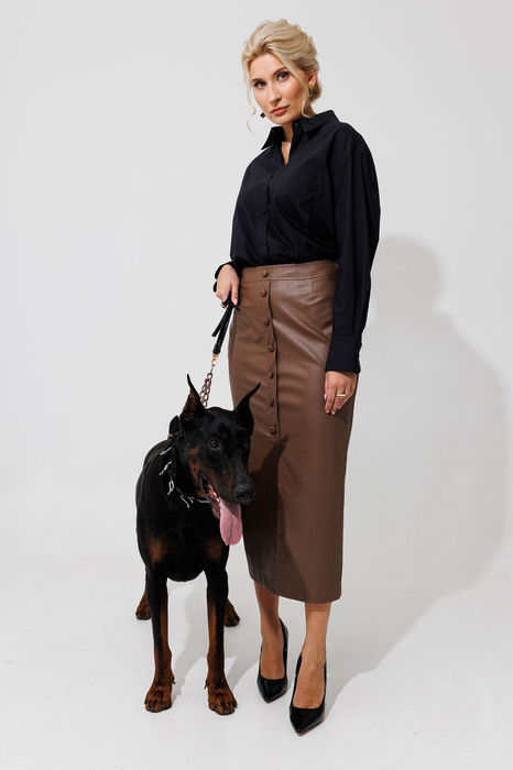 Кожанная юбка длины миди. По переду выполнена планка с пуговицыми заканчивающаяся разрезом. Зстежка в боковом на потайную молнию. По заднему полотнищу расположен разрез. Ее можно сочетать с рубашками, гольфом в обтяжку и уютными осенними свитерами. Материал очень практичный в носке.