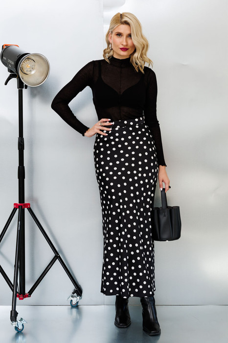 Юбка макси в горошек. Юбка на поясе, застежка на потайную молнию. Яркий элемент любого гардероба, который можно сочетать, как с рубашкой, так и со свободным свитером.