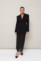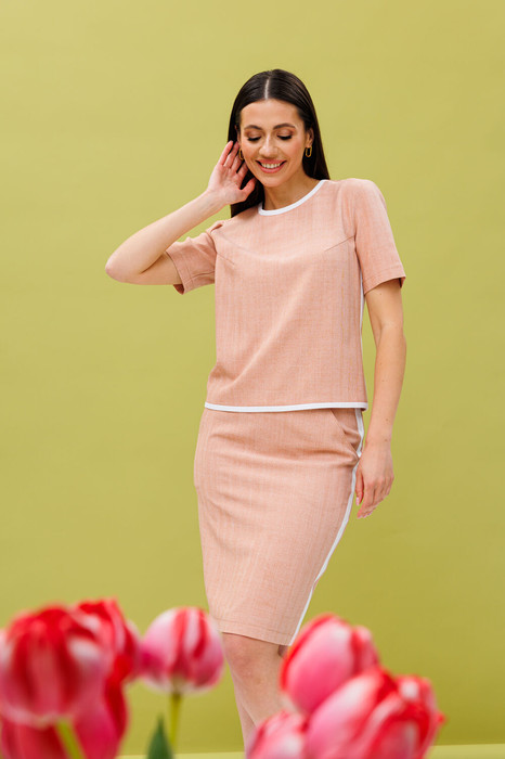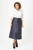Юбка на кокетке с боковыми, функциональными, наклонными карманами. С боковой вставкой из отделочной ткани, шириной 2,7 см. По среднему шву юбки потайная застёжка-молния, внизу разрез. Верхний край юбки обработан обтачкой. Юбка на подкладке. Длина юбки по боковому шву: для р.44-48: 59,5 см; для р.50-52: 62 см.