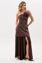 Юбка длиной миди, расклешенная к низу, с асимметричным низом. Пояс притачной, по спинке собран на резинку. Переднее полотнище состоит из трех частей. Правая часть скреплена отделочной строчкой и кнопками. В боковых швах изделия расположены карманы. По спинке изделия идёт средний шов и две вытачки для удачной посадки по фигуре. Юбка без подкладки.