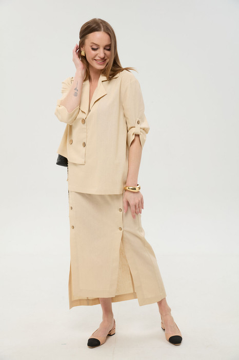 Юбка длиной миди, расклешенная к низу, с асимметричным низом. Пояс притачной, по спинке собран на резинку. Переднее полотнище состоит из трех частей. Правая часть скреплена отделочной строчкой и кнопками. В боковых швах изделия расположены карманы. По спинке изделия идёт средний шов и две вытачки для удачной посадки по фигуре. Юбка без подкладки.