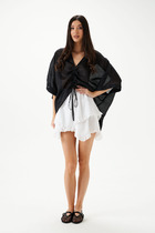Юбка длиной миди, расклешенная к низу, с асимметричным низом. Пояс притачной, по спинке собран на резинку. Переднее полотнище состоит из трех частей. Правая часть скреплена отделочной строчкой и кнопками. В боковых швах изделия расположены карманы. По спинке изделия идёт средний шов и две вытачки для удачной посадки по фигуре. Юбка без подкладки.