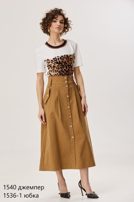 Женственная юбка силуэт трапеция длины миди. По переду заложены встречные складки. Имеются боковые карманы. Эта модель подчеркивает стройность фигуры и слегка приоткрывает ножку.