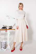 Женственная юбка силуэт трапеция   длины миди. По переду заложены встречные складки.  Имеются боковые карманы. Эта модель подчеркивает стройность фигуры и слегка приоткрывает ножку.