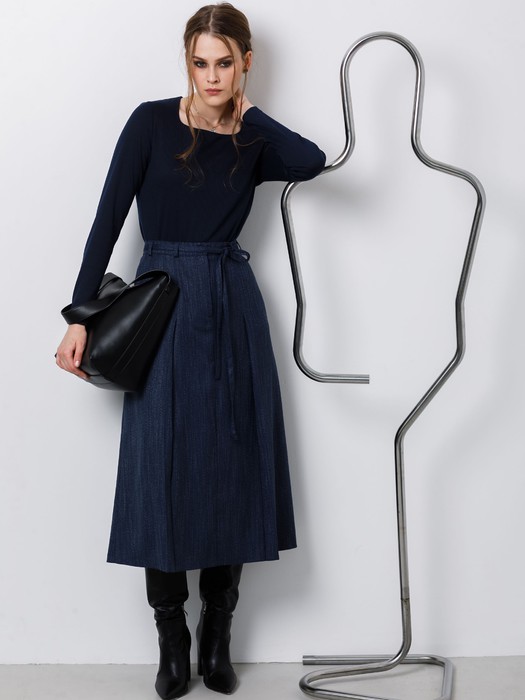 Модель А-образного силуэта, на подкладе. Пояс притачной, сзади частино собан на резину, со шлёвками. В шлёвки на поясе вставлен завязывающийся пояс-шнурок из основной ткани с наконечниками. Сзади в среднем шве обработана шлица. Спереди карманы в подрезных бочках и застроченные складки. В среднем шве застёжка на молнию и пуговицу на поясе.