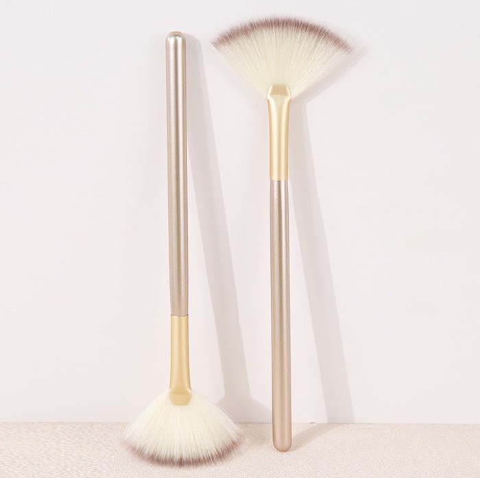 Легкая веерная кисть для пудры и хайлайтера, Легчайшая кисть идеально подойдет для нанесения самых темных, ярких и блестящих пигментов, румян и хайлайтеров. Незаменимая кисть-веер удобна в использовании и также отлично подойдет для коррекции макияжа, например для смахивания осыпавшихся теней. Сделана из мягкого таклона.Мыть кисть нужно с помощью небольшого количества моющего средства с водой, довести до нежной пены и промыть большим количеством воды.Промокнуть мягкой тканью и оставить сохнуть в горизонтальном положении.Способ применения: Для коррекции макияжа смахните кистью со скул осыпавшиеся тени. При нанесении пигментов или хайлайтера возьмите кистью небольшое количество средства, удалите излишки и начинайте наносить возвратно-поступательными движениями где это необходимо.