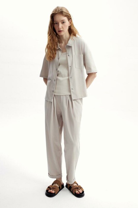 Трикотажные брюки с эластичным поясом, изготовленные из 100% хлопка, дарят ощущение комфорта и легкости. Имитация застежки и складки спереди придают изделию свободный силуэт. В сочетании с рубашкой-поло из этой коллекции, вы создадите стильный образ для теплых летних дней.
