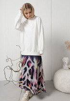 Базовый джемпер с объемными рукавами и лаконичным круглым вырезом. Манжеты, украшенные декоративными пуговицами и нижний край изделия вывязаны широкой резинкой, благодаря которой края не растягиваются.