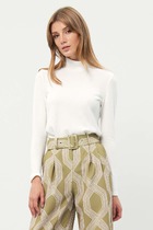 Уютный джемпер в стиле оверсайз со спущенным плечом и объемными рукавами из полушерстяной пряжи. Воротник-стойка застёгивается на молнию.
