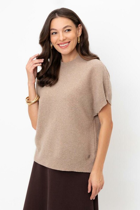 Уютный вязаный джемпер с короткими рукавами из шерсти. Комфортная посадка и цельнокроенные рукава придают изделию объем.