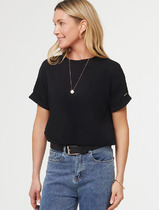 Джемпер поло с короткими рукавами из плотного набивного трикотажа интерлок с V-образным вырезом. Спущенное плечо придает изделию свободный силуэт.