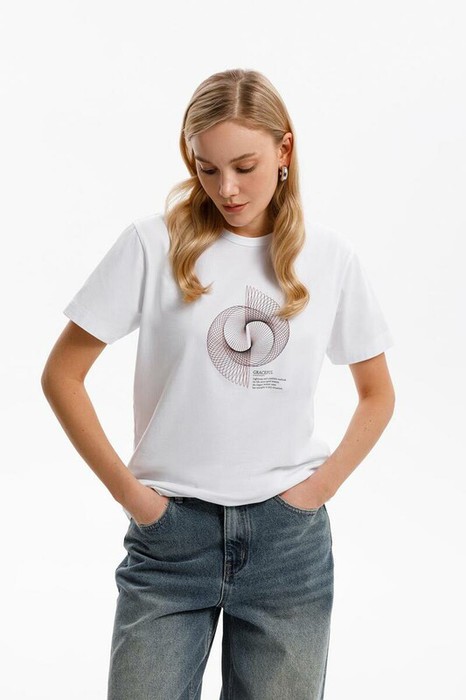 Футболка прямого силуэта из высококачественного гребенного хлопка с добавлением эластана. Мягкий на ощупь принт выполнен из водных красок, что обеспечивает устойчивость к многократным стиркам.