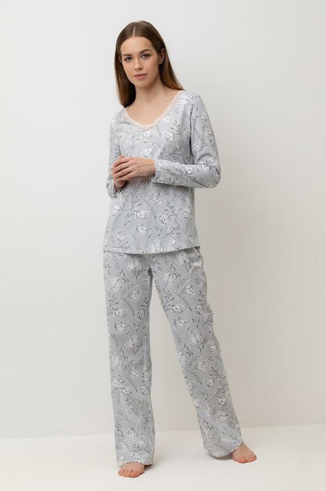 Легкий комплект для комфортного сна и отдыха набивного трикотажа с нежным рисунком из 100% натурального хлопка. Джемпер с V-образным вырезом, украшенный эластичным кружевом комфортно садится по фигуре. Брюки с поясом на резинке и атласной лентой. Гладкий материал приятен к телу и позволяет коже дышать.