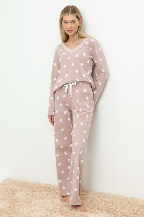 Лёгкий комплект для комфортного сна и отдыха из 100% натурального хлопка. Выполнен из набивного трикотажа с нежным рисунком. Джемпер с длинными рукавами и глубоким V-образным вырезом с мягким кружевом комфортно садится по фигуре. Просторные брюки с мягким поясом на резинке регулируются лентой. Гладкий материал приятен к телу и позволяет коже дышать.