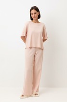 Комплект для сна и отдыха из натурального хлопка с добавлением лайкры. Футболка стандартной длины комфортно садится по фигуре. Укороченные просторные брюки с карманами из набивного трикотажа с мягким поясом на резинке.