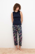 Комплект для сна и отдыха из натурального хлопка с добавлением лайкры. Футболка стандартной длины с принтомкомфортно садится по фигуре. Укороченные просторные брюки с карманами из набивного трикотажа с мягким поясом на резинке.