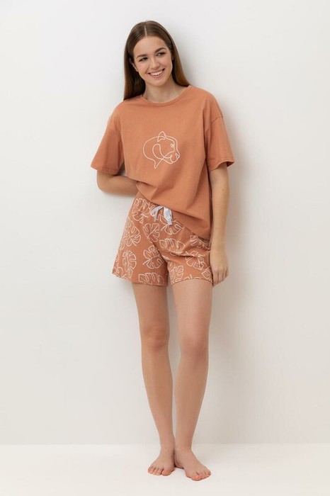 Комплект для комфортного сна и отдыха из трикотажа с нежным рисунком из 100% натурального хлопка. Футболка с короткими рукавами и спущенной линией плеча комфортно садится по фигуре. Шорты с мягким поясом на резинке. В поясе шорт атласная лента. Свободный силуэт не сковывает движения.