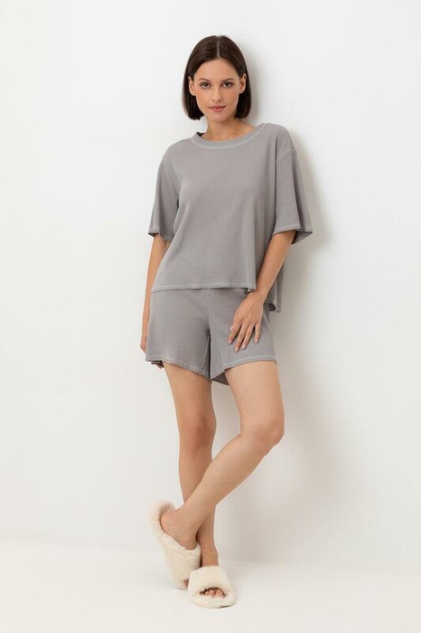 Комплект из объемного трикотажа с добавлением эластичных волокон. Свободный силуэт и мягкий пояс  обеспечат комфорт во время сна и отдыха.