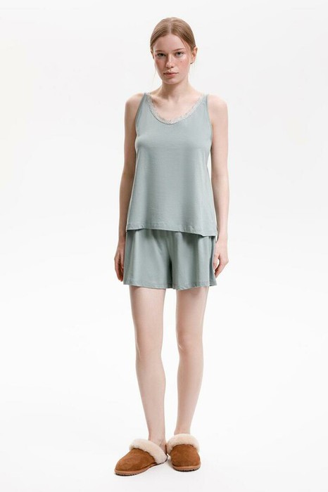 Легкий комплект приглушенного зеленого оттенка выполнен из хлопка с нежнейшим модалом. Свободный крой топа декорированный эластичным кружевом и мягкий пояс шорт обеспечивают легкость и свободу движений.